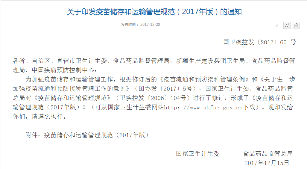 關(guān)于印發(fā)疫苗儲存和運(yùn)輸管理規(guī)范(2017年版)的通知
