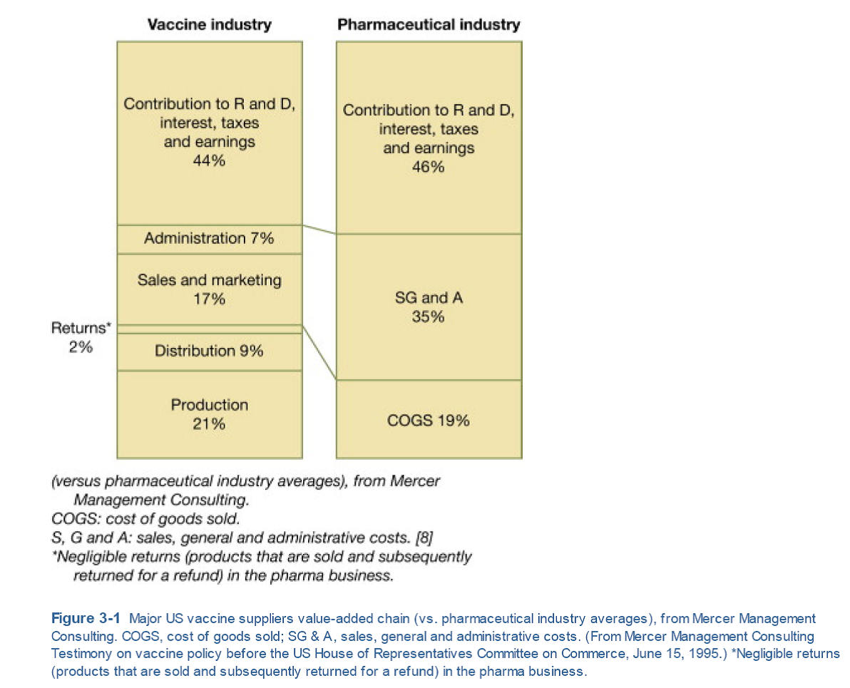 在美國的調(diào)查結果表明,這兩個產(chǎn)業(yè)在研發(fā)投入、利息、稅收、扣除成本后的收益等方面非常接近( 分別為44%46% )。然而成本方面相差非常大,其中疫苗產(chǎn)業(yè)在生產(chǎn)和分銷(包括產(chǎn)品的生產(chǎn)、分銷和退貨) 方面的成本(32% )顯著高于制藥產(chǎn)業(yè)(19%),而后者在銷售、市場和管理方面的成本則高于疫苗產(chǎn)業(yè)( 分別為35% 24% )。