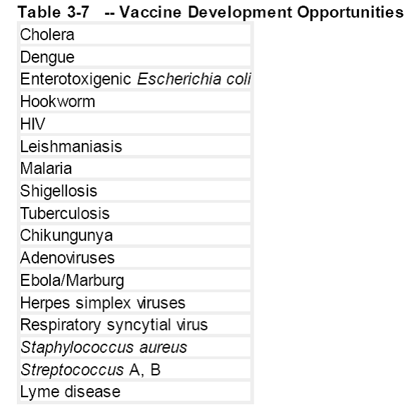 疫苗研發(fā)資金來源于政府、產(chǎn)品銷售收益風險投資和慈善基金等。NIH 與其他聯(lián)邦機構和項目競國家稅收資金的支持,通常情況下前者更容易獲資助。同樣,DODFDA.CDC USAID 贊助的疫苗研發(fā)項目也要與其他公共需求競爭資金,而且取決于政府的行政和立法部門。近來,針對生物恐怖疫苗( 炭疽和天花)和新發(fā)病原疫苗(埃博拉、西尼羅河病毒和流感大流行)的經(jīng)費投入不但可能對疫苗研發(fā)和生產(chǎn)產(chǎn)生深遠影響,而且可能促生疫苗行業(yè)新成員。