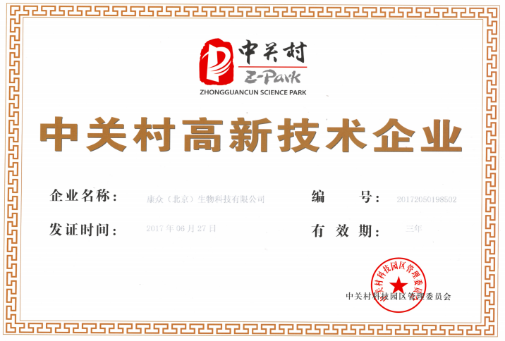 康眾(北京)生物科技有限公司榮獲“中關(guān)村高新技術(shù)企業(yè)”